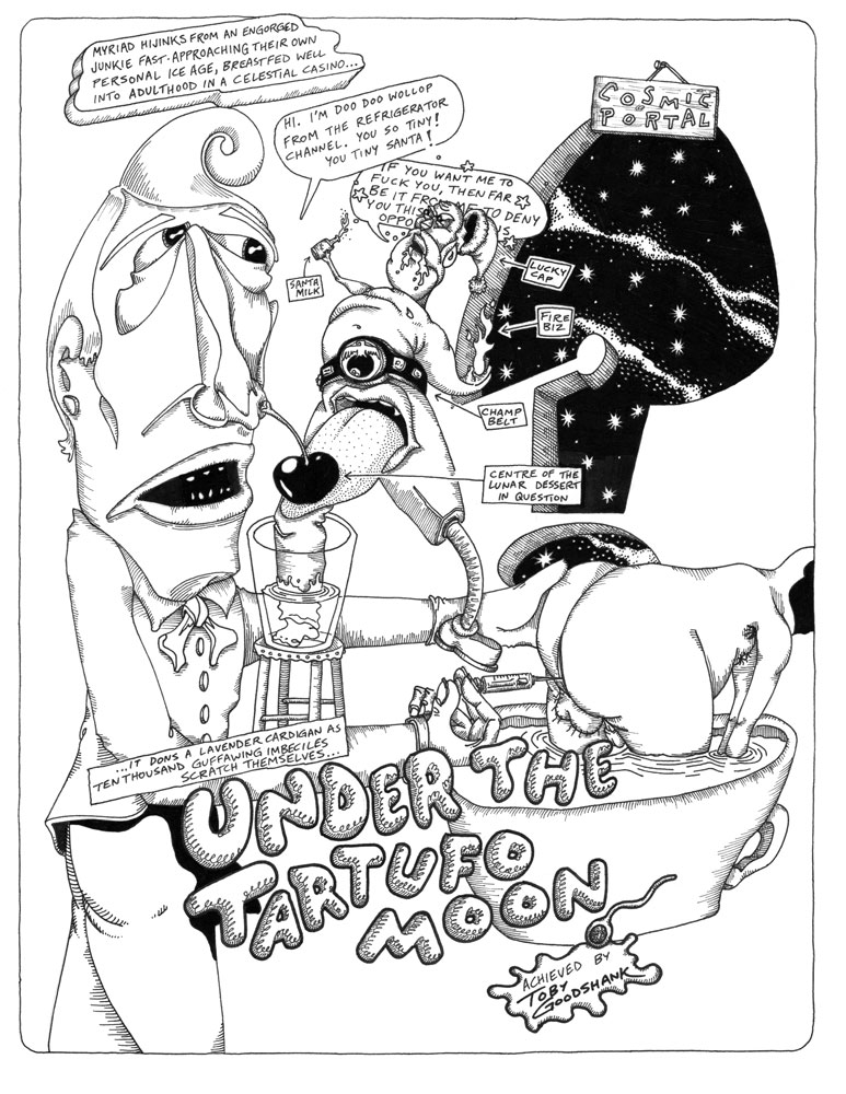 An ill-advised trip down another planet's pop culture rabbit hole. Drawn in an exacting and playful line, Tartufo is a combination of surreal wordplays and explicit renderings, at once offensive, silly, and surprisingly sweet. Children beware, this yogurt solo's for adult eyes only! ;)